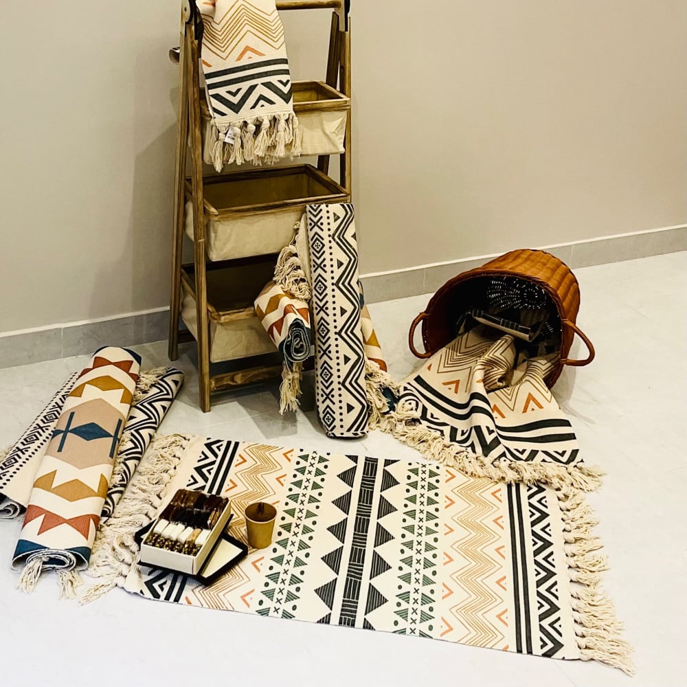 - البساط المصنوع من القطن والمزخرف بأشكال متعددة طريقة مثالية لإضافة عنصر تقليدي لديكور منزلك او مكتبك او لأي مكان آخر.