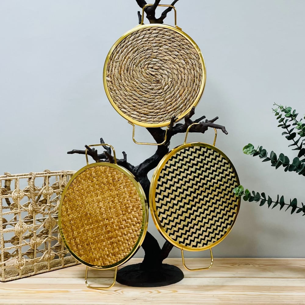 صينية تقديم دائرية بإطار ذهبي أنيق بتصاميم مختلفة تضيف لمسة جمالية فريدة لكل مناسبة. الصواني مصنوعة من خامات عالية الجودة تجمع بين الطبيعة والفخامة، فهي مثالية لتقديم الحلويات، الفواكه أو المشروبات للضيوف، كما يمكن استخدامها كقطع ديكور راقية على الطاولة أو المطبخ.