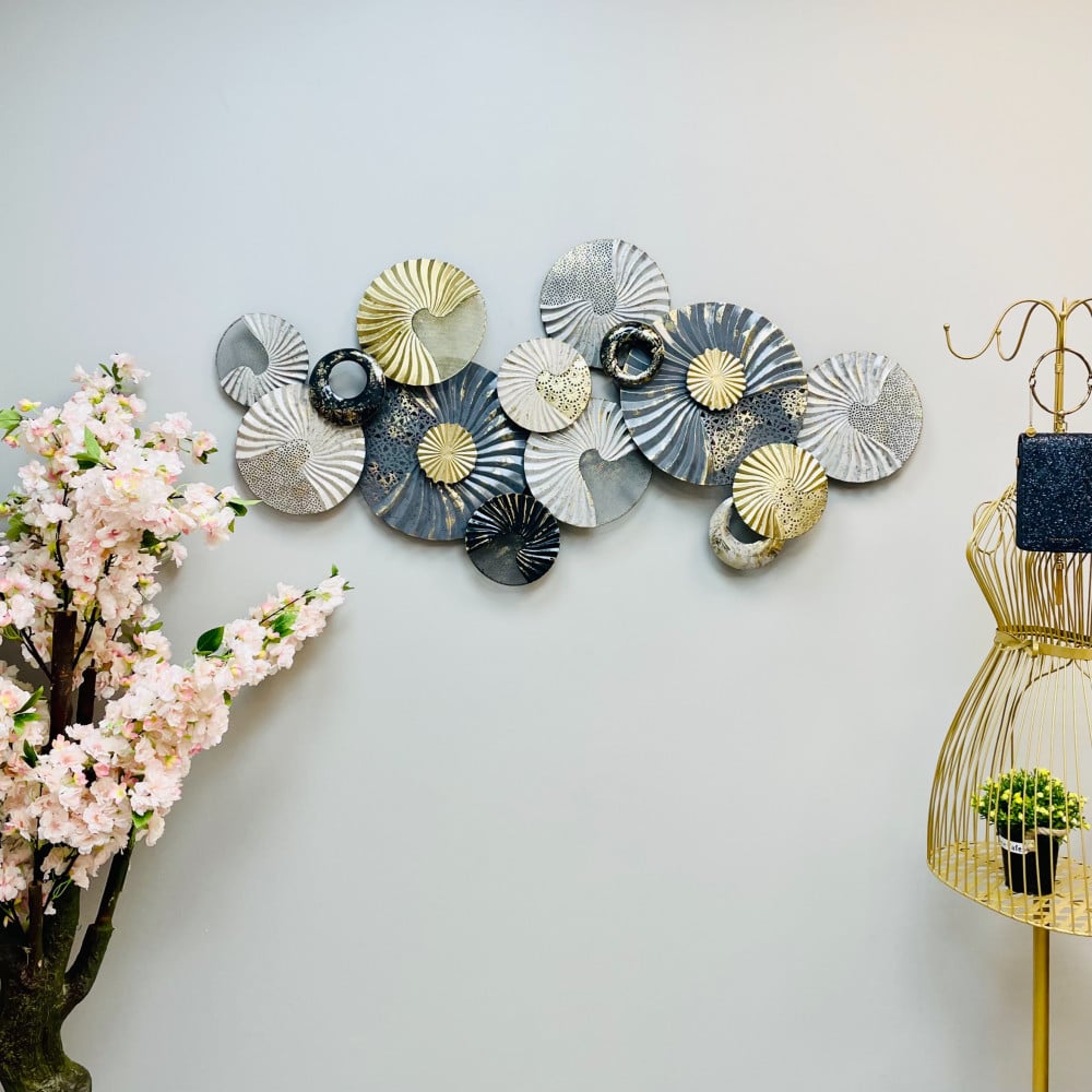 - لوحة جدارية حديد ملون رمادي وابيض وذهبي بشكل دوائر انتيك
